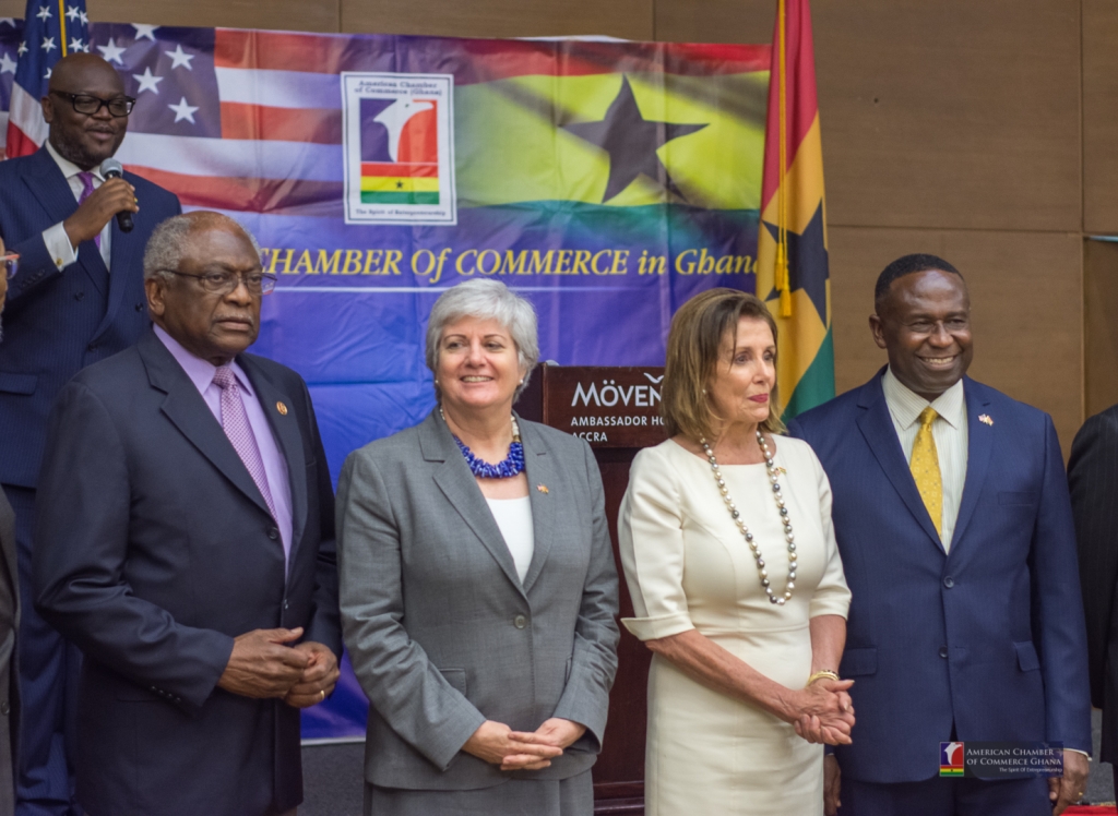 Monday, July 29, 2019. The American Chamber of Commerce, Ghana, organized the 2019 AmCham U.S. – Ghana Business Reception to host the U.S. Congressional delegation led by Nancy Pelosi, Speaker of the United States House of Representatives. The event was part of Nancy Pelosi’s visit to the country to hold high-level discussions with Ghana’s President, Speaker of Parliament, and other senior government officials and was attended by the United States Ambassador to Ghana, Stephanie S. Sullivan, the Minister for Trade and Industry, Alan Kyerematen, AmCham Ghana Members and associates.
